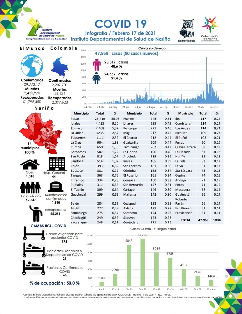 El reporte oficial del Instituto Departamental de Salud de Nariño, (Informativo N°320, emitido a las 6:00 de la tarde del 16 de febrero de 2021 da cuenta que en el Departamento de Nariño se totalizan 47.969 casos positivos para Covid-19. Ocupación de camas UCI en Nariño 50.0%. Se totalizan 1.550 muertes desde el comienzo de la Pandemia.