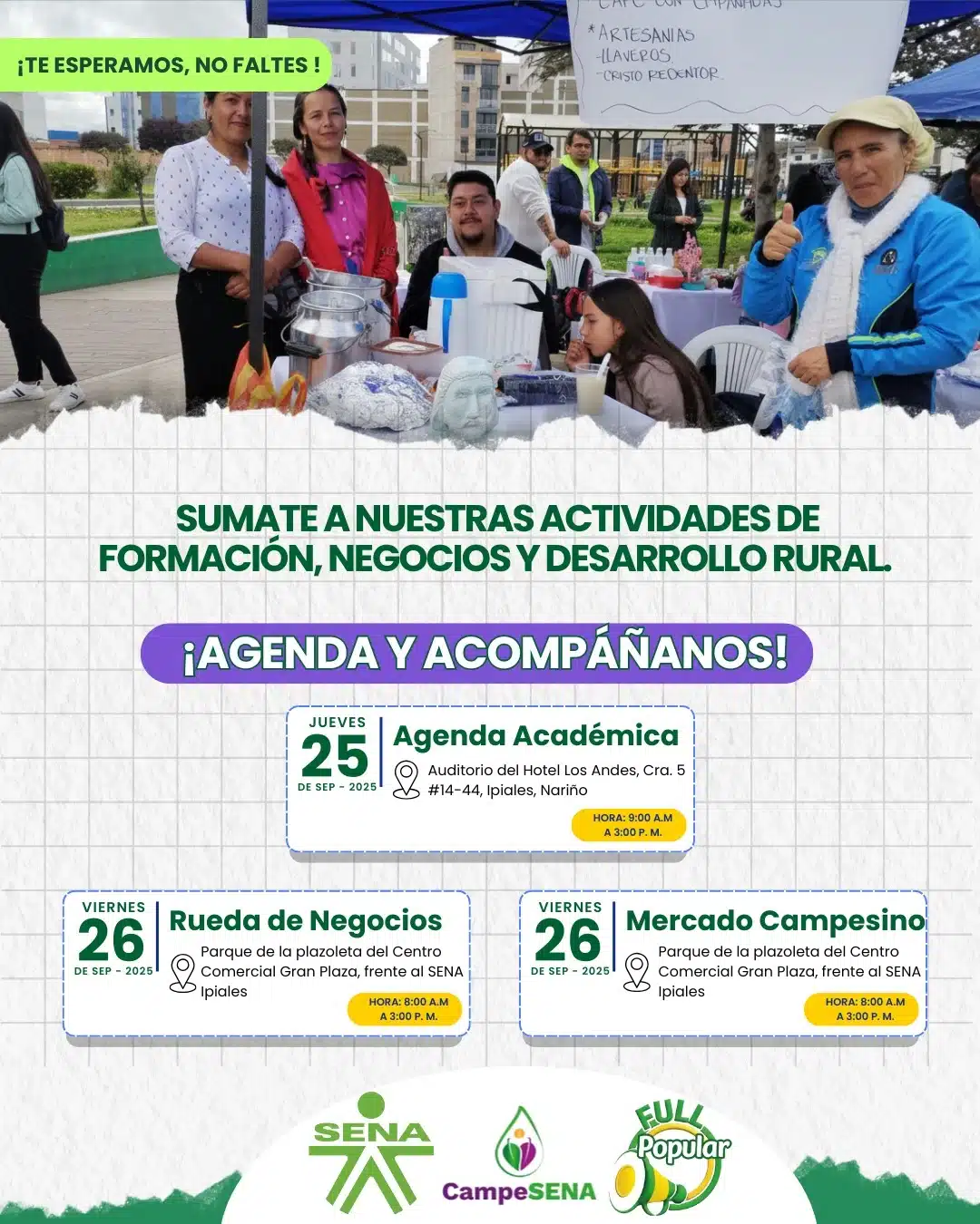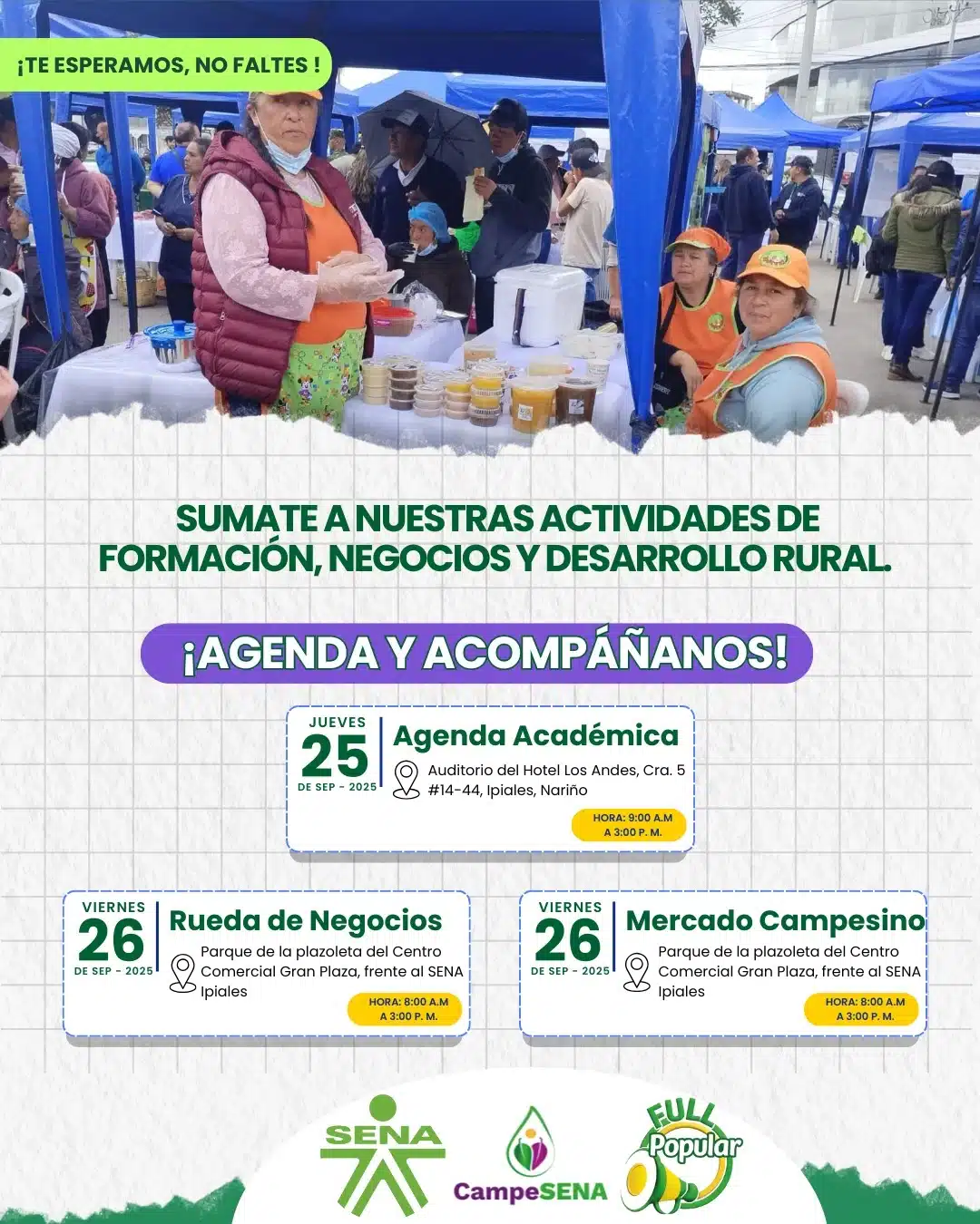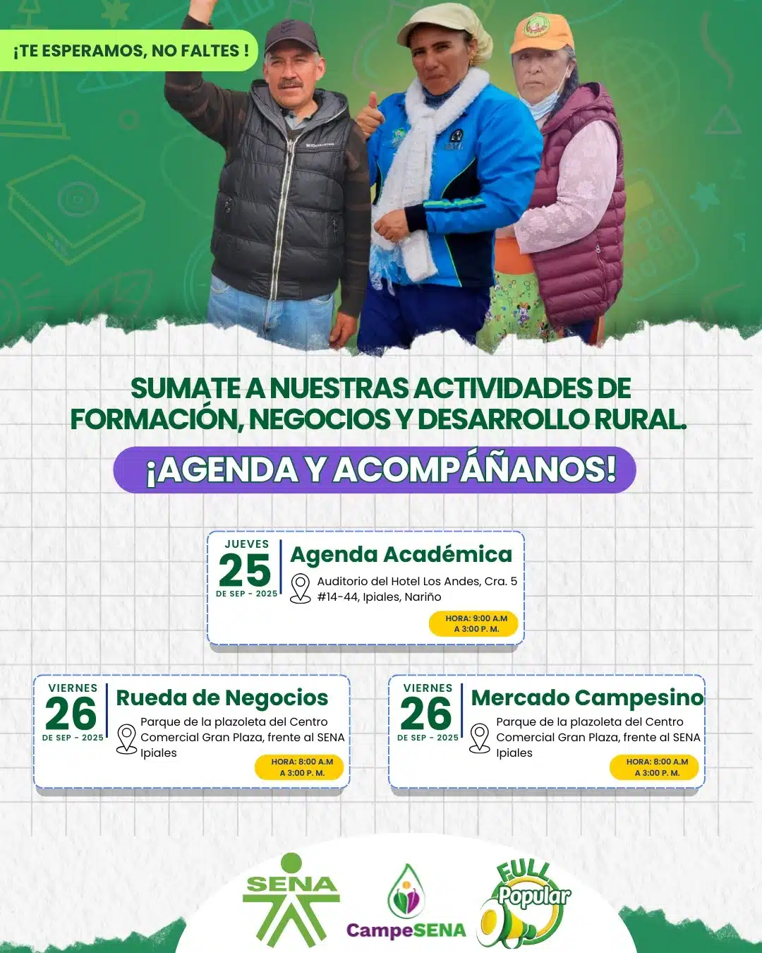 Juan Carlos Trejo, coordinador del programa en la sede de Ipiales, destacó que este encuentro “permitirá a los aprendices y productores rurales compartir conocimientos, generar contactos y acceder a información técnica que impulse el crecimiento de sus emprendimientos”. En la cita participarán invitados especiales provenientes de la exprovincia de Obando, quienes compartirán experiencias exitosas de organización y comercialización.